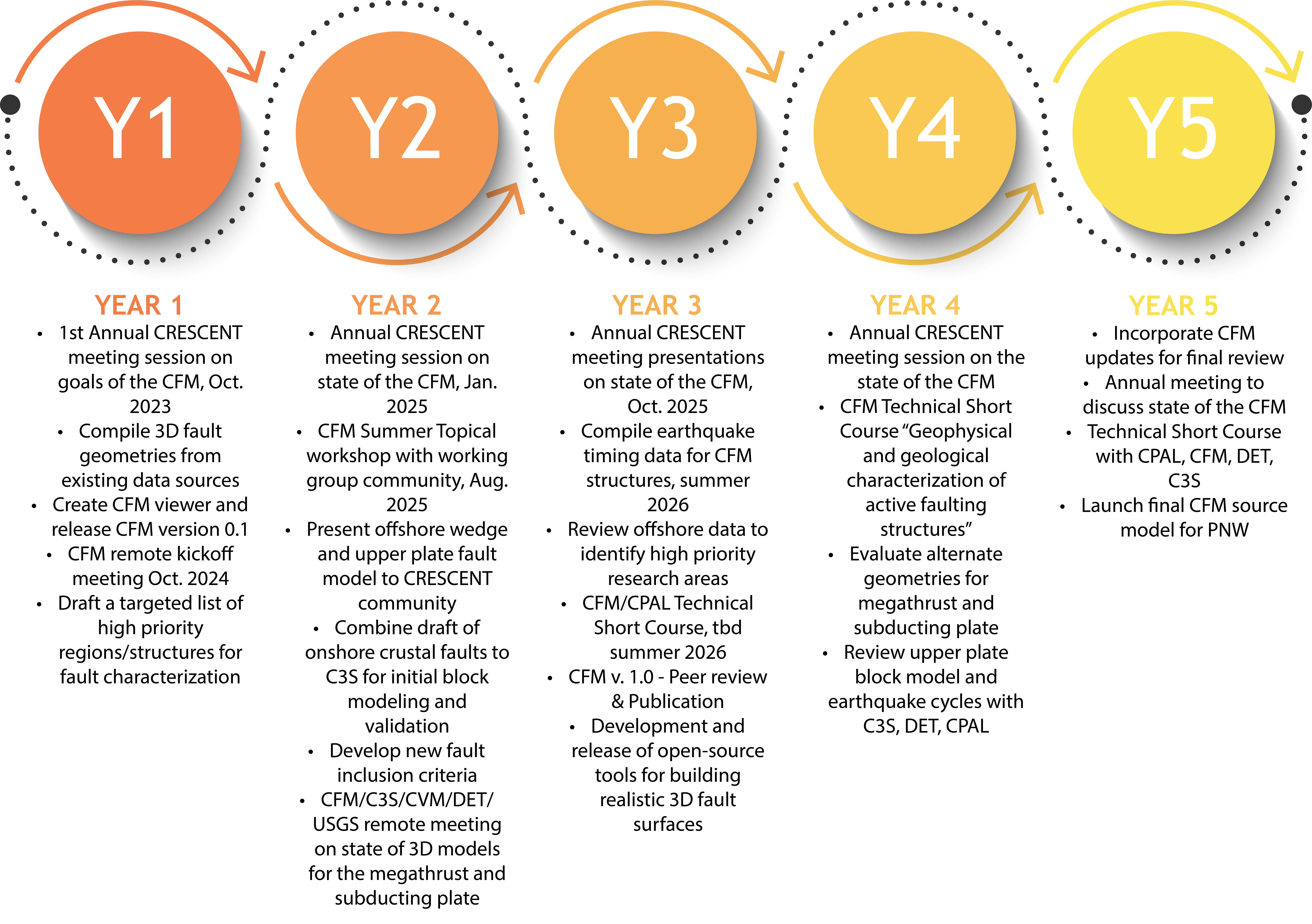 The CFM will represent known onshore and offshore fault zones of the Pacific Northwest. Known faults will be included in CFM if they meet a set of community standards defined based on input from geologists and geophysicists in academia, state, and federal agencies and other stakeholders. The CFM will include the most detailed spatial representations of faults possible, kinematics, slip rates, relevant data, and other metadata. When possible, the CFM will also include timing of past earthquakes and estimates of their source properties.